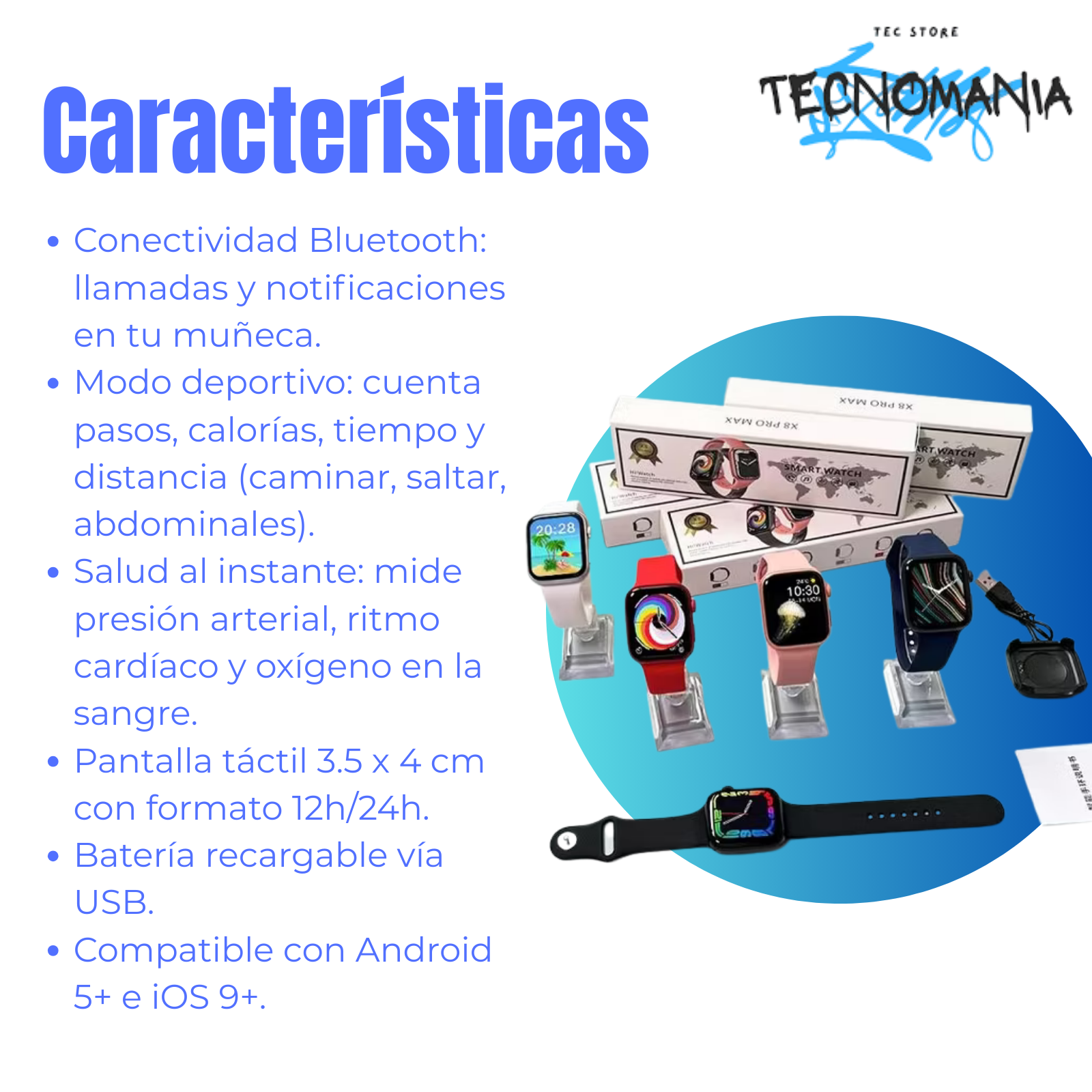 El Smart Watch X8 Max combina moda y funcionalidad en un solo dispositivo. Con conexión Bluetooth, recibe llamadas y notificaciones de redes sociales, además de ayudarte a cuidar tu salud con sus múltiples sensores.